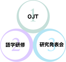 当社ではOJTを中心として、語学、研究成果の発表(研究職のみ)という3つの制度で、仕事に必要とされる能力を身につけることが出来ます。