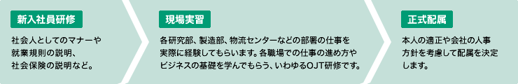 入社後約1週間の新入社員研修の後、3ヵ月間の現場実習を通じて、会社全体の仕事の流れ、各部署の役割等を学んでもらいます。
